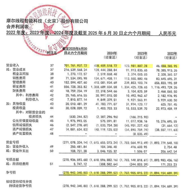截至2025年6月30日,摩尔线程累计未弥补亏损为14.78亿元。公司表示:基于市场空间、产品研发、客户接洽及导入情况等,最早可于2027年实现合并报表盈利。