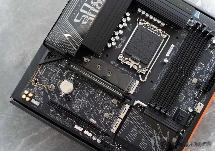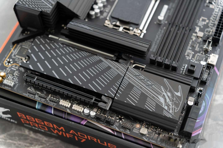 在PCIe插槽的配置方面,技嘉B860M Pro WIFI 7电竞雕也是堆了“猛料”,首先是搭配了一个PCIe 5.0*16的显卡插槽以及一个PCIe 5.0 M.2插槽。对于Nvdia RTX 5090系和AMD RX 9700XT两家的旗舰级显卡,都可以充分发挥其能效。除此之外,还搭配了2个PCIe 4.0 M.2插槽,用于存储扩展。 另一方面PCIe 5.0 M.2插槽在显卡插槽的上方,这样就不会出现安装显卡后遮挡SSD位的情况出现。