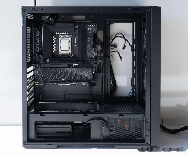 将主板装入机箱内,技嘉B860M Pro WIFI 7电竞雕为M-ATX主板,放到这个ATX机箱中,会获得更大的散热空间。