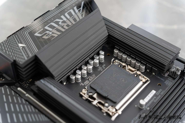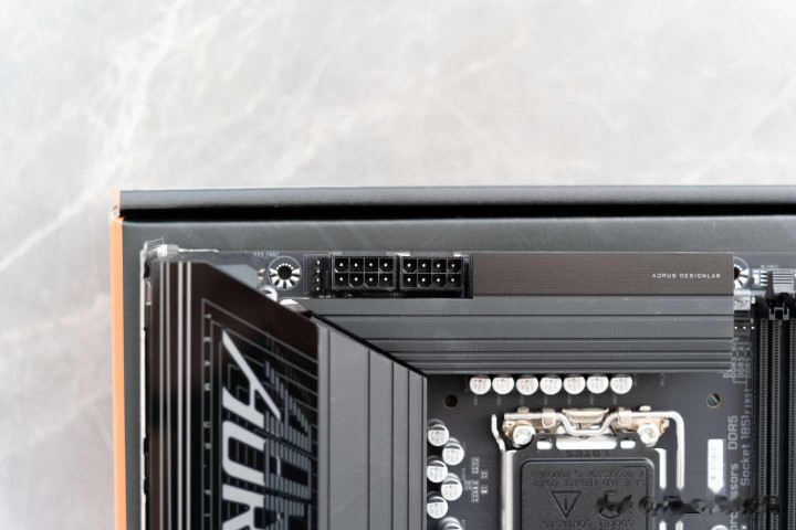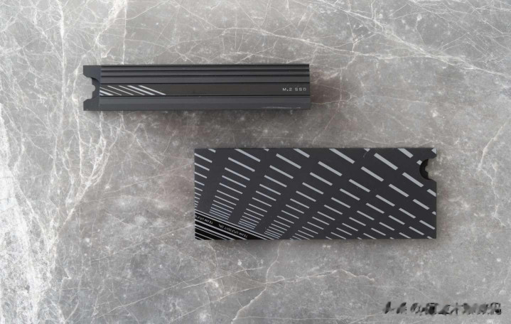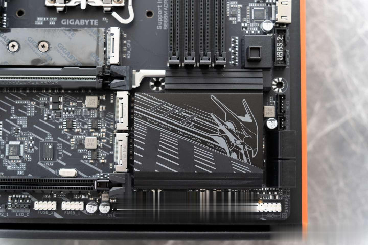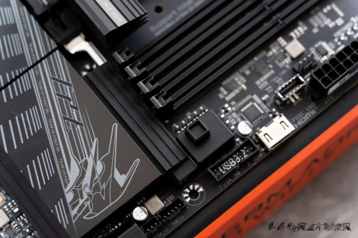 PCIe 5.0 M.2以及PCIe 4.0 M.2的接口上方都有散热装甲覆盖,散热装甲采用卡扣方式固定,无需螺丝刀就可以一键拆卸和安装。散热装甲的体积也非常大且厚实,能够有效的将热量排出。