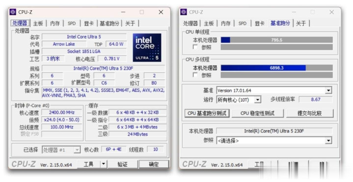 使用CPU-Z进行测试,Intel Ultra 5 230F的TDP功率只有约64W,置换进行基准跑分,单线程得分为795.5分,多线程跑分为6898.3分。