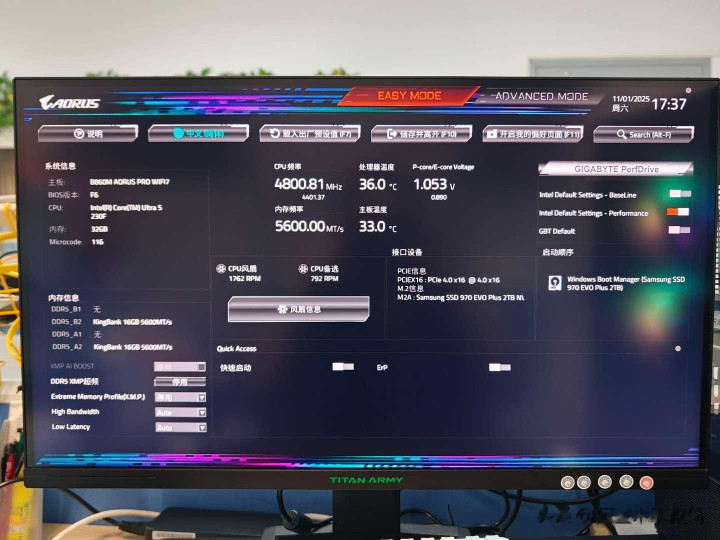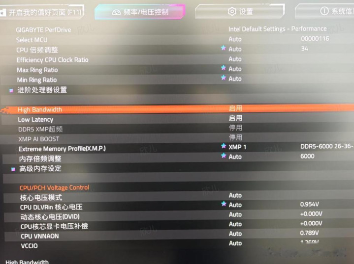 装机完成,通电开机一次点亮!开机后,首先进入BIOS进行设置。技嘉B860M Pro WIFI 7电竞雕支持在BIOS 中一键开启XMP或EXPO进行内存超频,同时在高级控制能,也可以手动开启高带宽和低延迟的选项,而且最高频率支持到9466。
