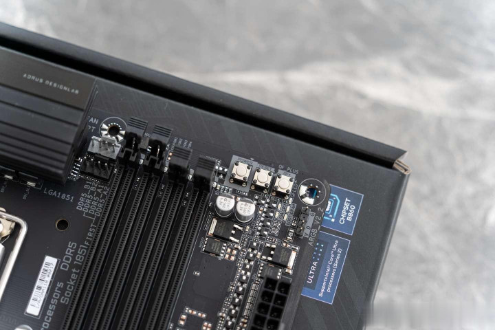 技嘉B860M Pro WIFI 7电竞雕带有显卡快拆设计,通过按下主板右侧的按钮,就可以轻松将显卡拆卸。