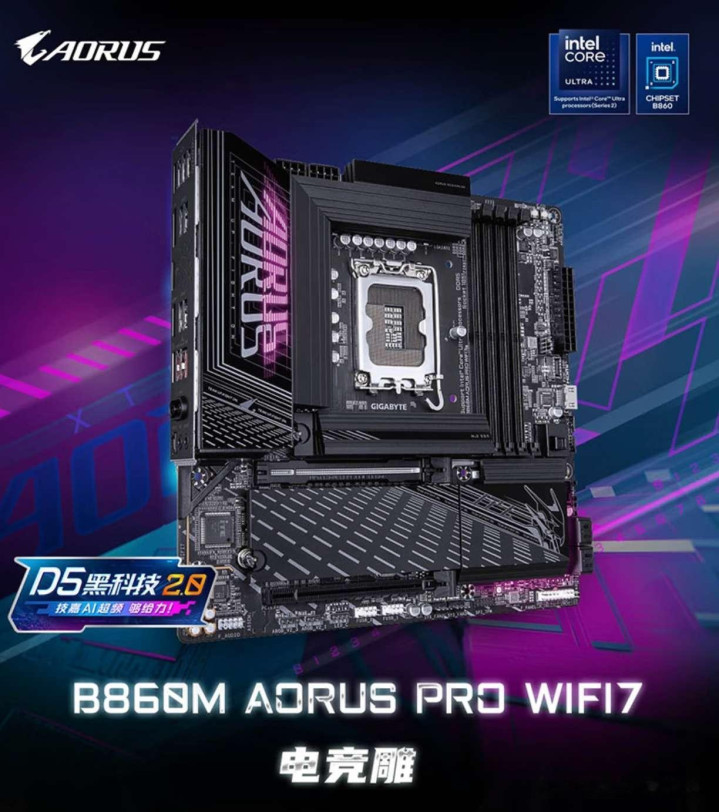 技嘉B860M Pro WIFI 7电竞雕是一款标准的M-ATX主板,可以自由搭配M-ATX或ATX机箱使用。主板以深邃的黑色为视觉风格底色,正面散热马甲上用连接线进行连接,同时带有赛博朋克风格的“AORUS”字样,电竞科技感十足。