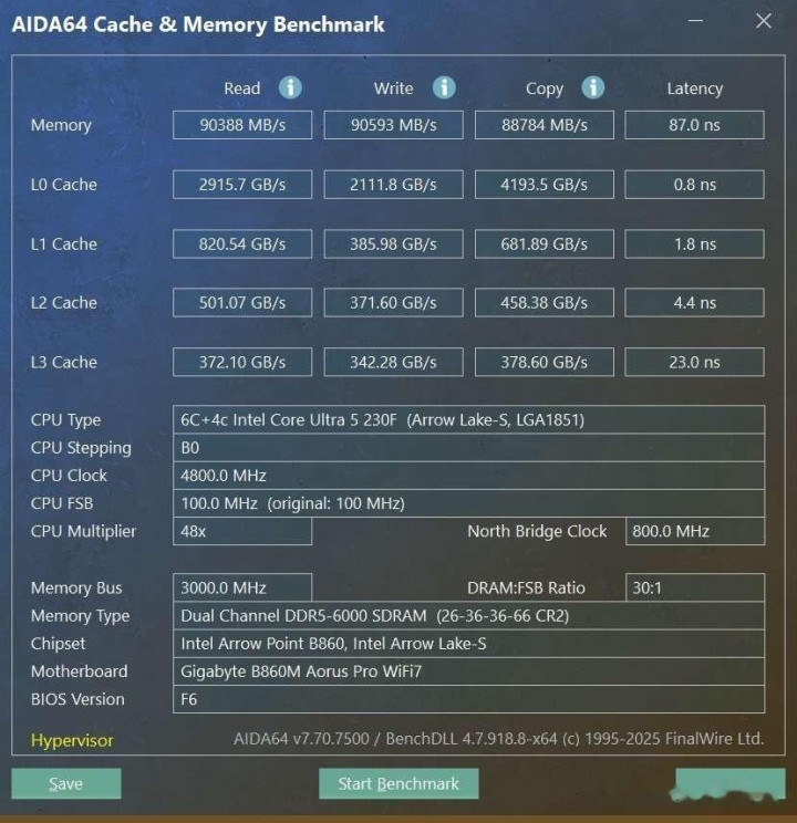 之后使用AIDA64对内存进行跑分,最后实测读取速度为90388MB/s,写入为90593MB/s,延迟为87ns。实测比未开启高带宽和低延迟选项的情况相比,传输速度更快,延迟更低。
