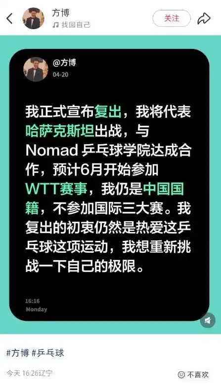 配资头条官网 前国乒球员方博宣布复出:将代表哈萨克斯坦出战,仍是中国国籍,不参加国际三大赛,想重新挑战一下自己的极限 宣布 来源:长城策略 网站:爱配资 日期:2026-04-22 10:55:36 查看:93