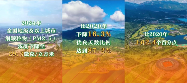 2024年,全国地级及以上城市细颗粒物(PM2.5)浓度下降至29.3微克/立方米,比2020年下降16.3%,优良天数比例达到87.2%、比2020年上升2.4个百分点;地表水优良水质断面比例为90.4%,首次超过90%,长江、黄河全线干流水质连续多年保持Ⅱ类;各类突发环境事件均得到妥善处置。人民群众生态环境满意度连续4年超过90%。